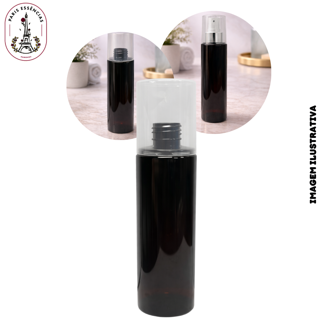 Frasco em PET na cor âmbar, acompanhado de sobre tampa cristal, ambos fabricados em plástico de alta qualidade. Ideal para a produção de body splash, colônias, perfumes leves e soluções cosméticas, oferecendo proteção ao conteúdo e um visual elegante e profissional.