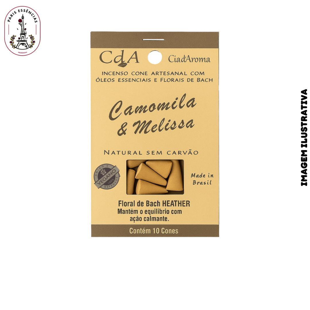 O Incenso Cone Camomila e Melissa da Cia de Aroma é produzido artesanalmente com ingredientes 100% naturais, livre de carvão e substâncias tóxicas. Contém óleo essencial de camomila e melissa e floral de Bach Heather, proporcionando uma fragrância suave e reconfortante que acalma a mente, equilibra as emoções e cria uma sensação de tranquilidade e bem-estar.