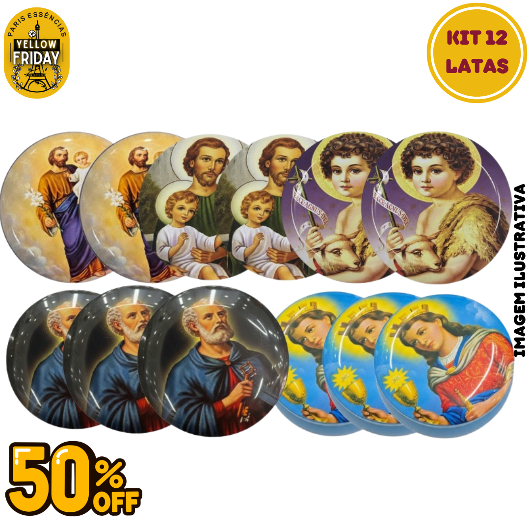 Kit 12 Latas Decoradas Religiosas – Estampas Variadas | 50% de Desconto