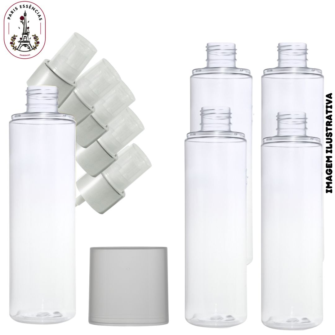 Destaque seus produtos com mais elegância! O Kit com 5 Frascos PET de 200ml modelo baixo acompanha válvulas spray prata lisas de plástico, trazendo um visual sofisticado e moderno para sua linha de body splash, colônias ou cosméticos líquidos.