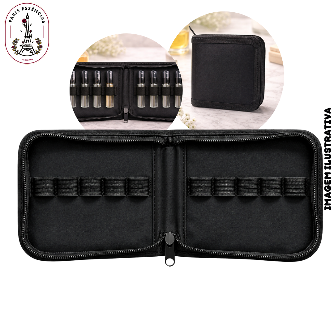 O estojo possui espaços individuais que permitem acomodar até 10 frascos, mantendo tudo organizado e protegido durante o transporte ou apresentação aos clientes.
