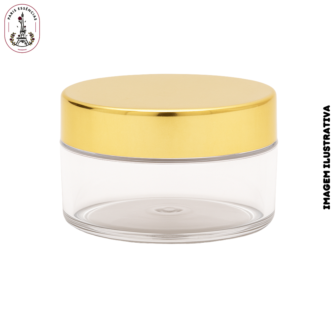 Este modelo possui design sofisticado e funcional, com tampa dourada fosca na parte superior e acabamento metalizado ao redor, conferindo elegância e modernidade ao produto. A rosca de vedação garante um fechamento seguro, ideal para manter a integridade e conservação do conteúdo.