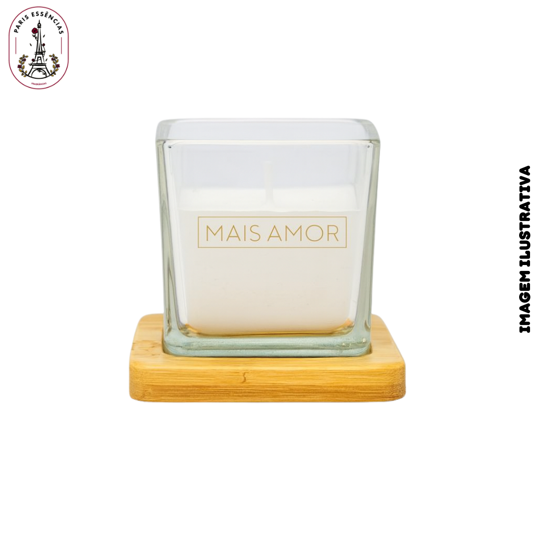 Vela Decorativa "Mais Amor" Quadrada com Base em Madeira – Sem Cheiro